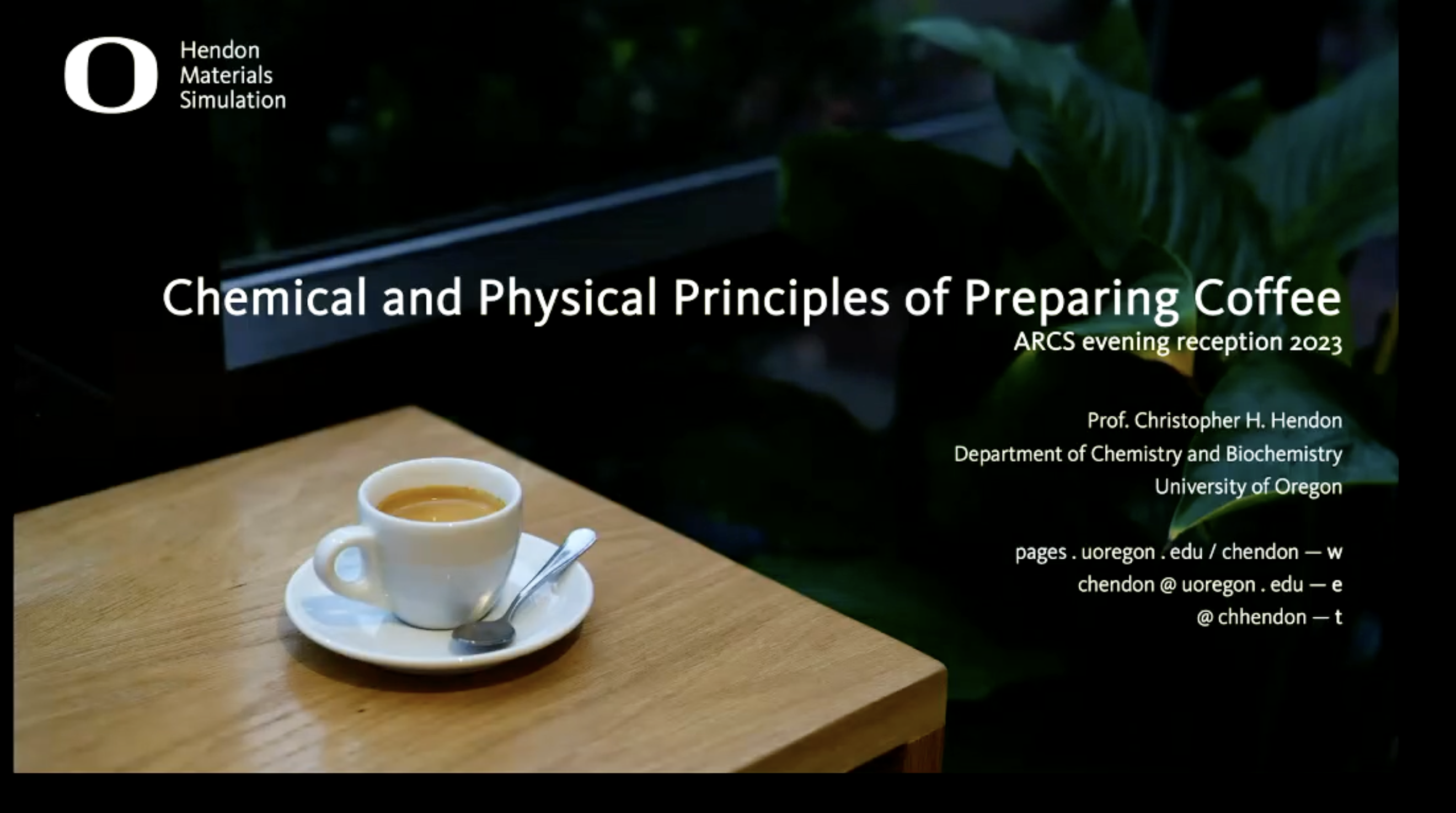 Dr. Christopher Hendon, University of Oregon Assistant Professor of Computational Materials Chemistry, is leading a four-year project on espresso extraction in collaboration with an Italian coffee machine manufacturer, Oregon State University, and the University of Portsmouth (in the UK). The project will develop guidelines for espresso extraction and the first brewing "control chart" to provide the optimum water-to-bean brewing ratios for the ideal cup of coffee. The Atlantic magazine calls Dr. Hendon, "specialty coffee's resident scientist."