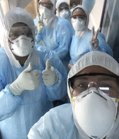 In the photo the lab just finished their first set of RNA extractions. Their job is not high risk since they do not work directly with patients. The highest risk comes in their first step of the RNA extractions when they add a lysis buffer to the sample material. After that, all virus particles should be inactive.